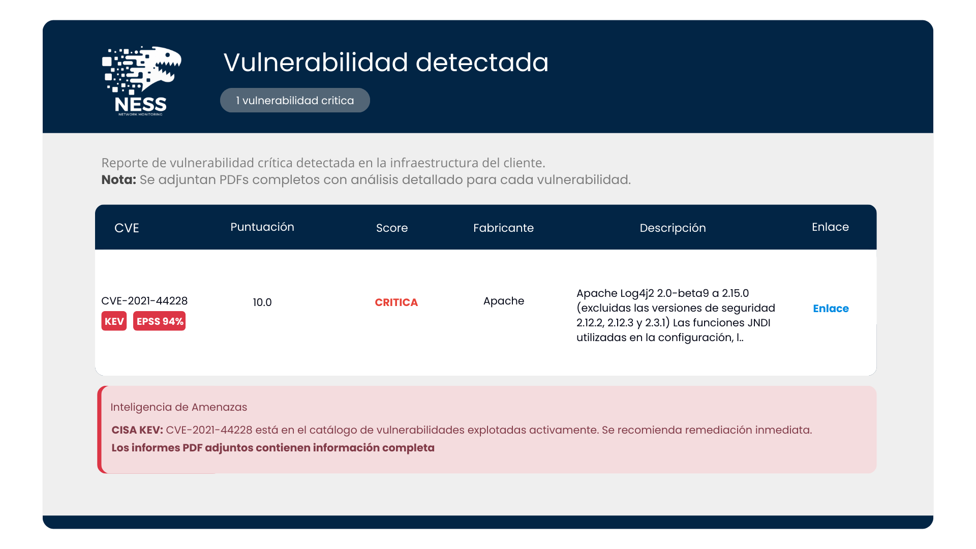 For companies seeking strict regulatory compliance and real attack surface reduction, NESS goes a step further by natively integrating the Known Exploited Vulnerabilities (KEV) catalog from the U.S. Cybersecurity and Infrastructure Security Agency (CISA).